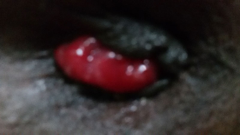 Prolapsed hemorrhoids look like swollen red lumps or bumps outside your anus. You may be able to see them if you use a mirror to examine this area. Prolapsed hemorrhoids may have no other symptom than the protrusion, or they may cause pain or discomfort, itchiness, or burning.